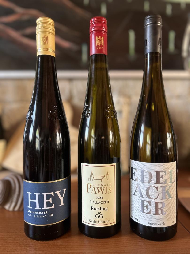 Dreimal Riesling VDP.GROSSES GEWÄCHS®! Mit diesem Paket erhalten Sie je eine Flasche Riesling der VDP.Weingüter Böhme & Töchter, Hey und Bernard Pawis aus gleich zwei VDP.GROSSE LAGEN®. Beide, der Freyburger Edelacker und der Naumburger Steinmeister sind geprägt von einem kühl trockenen Kontinentalklima, steilen, nach Süden exponierten Hängen und tiefen, verwitterten Muschelkalkböden. Berge wie geschaffen für ganz großen Riesling.